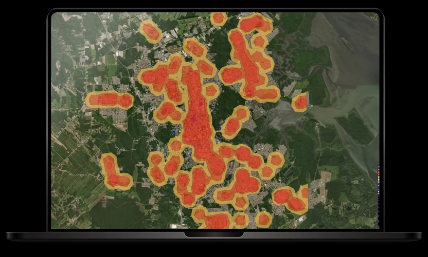 Combine risco, presença inimiga, infraestrutura, tráfego e dados sociais em um só visual dinâmico. Identifique zonas onde fatores críticos convergem.